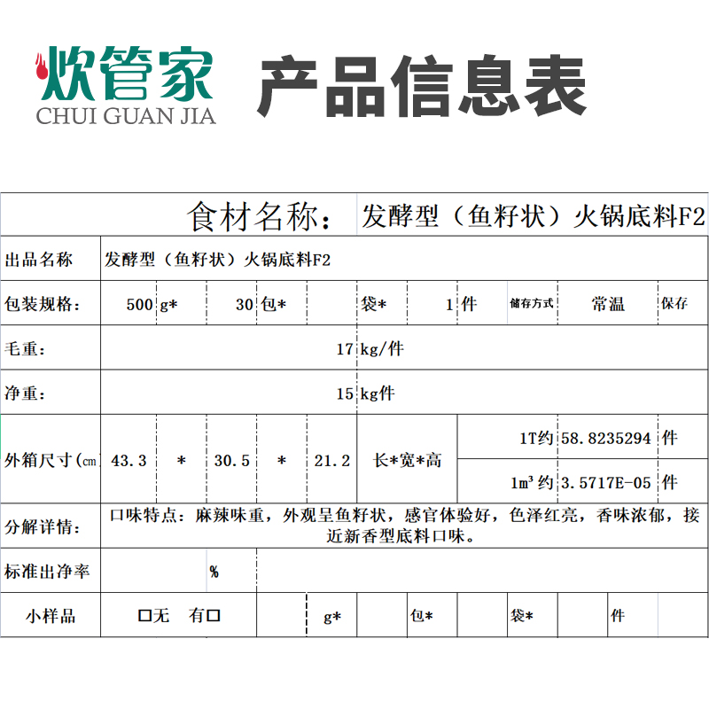 本产品是一款独特风味的发酵型火锅底料,采用传统发酵工艺,结合现代科技精制而成。其独特的鱼籽状设计,不仅方便携带和保存,更能让您在烹饪过程中轻松掌握用量,享受火锅的无限乐趣。